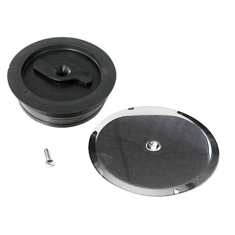 100 mm Idroblok black nylon expansion waste drain cover with 140 mm stainless steel plate and screw.
