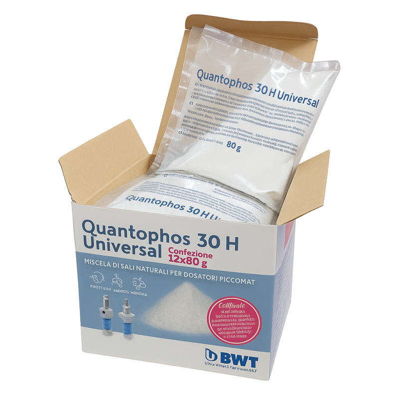 Powdered polyphosphate BWT Quantophos 30 H, food grade for Piccomat proportional feeders. Prevents scale and corrosion, with the following characteristics: