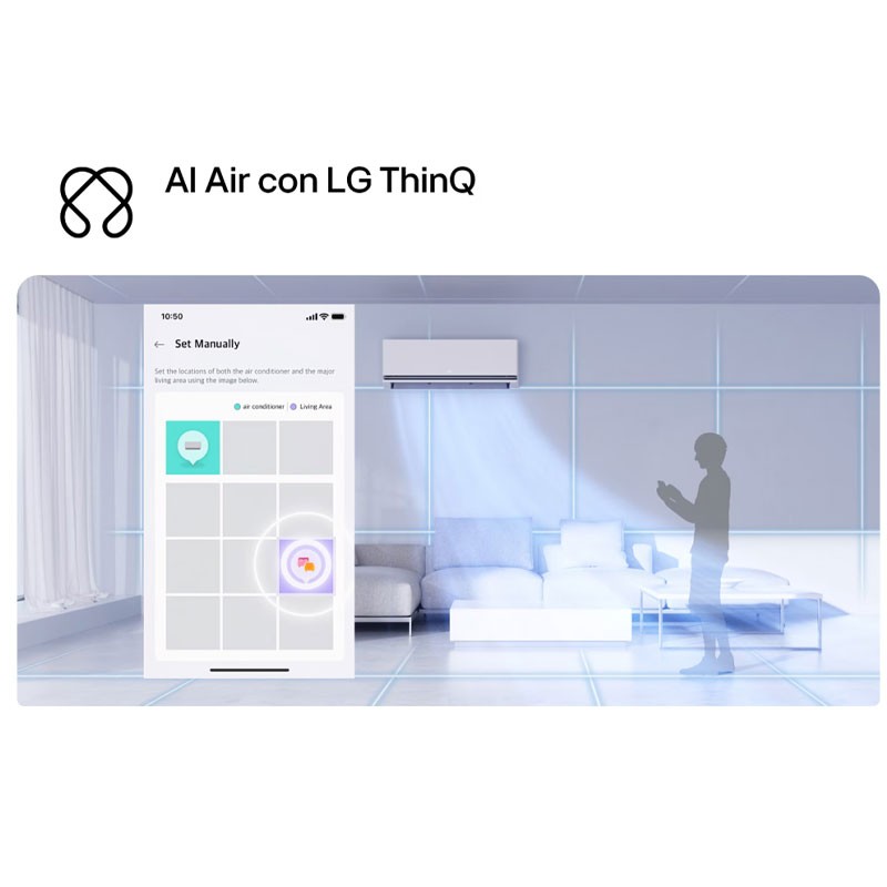 La tecnología AI Air analiza el entorno, ajusta la temperatura y el flujo de aire automáticamente para garantizar un confort a medida. Al configurar la ubicación en la app LG ThinQ™, la inteligencia artificial adapta el aire acondicionado a tus hábitos.