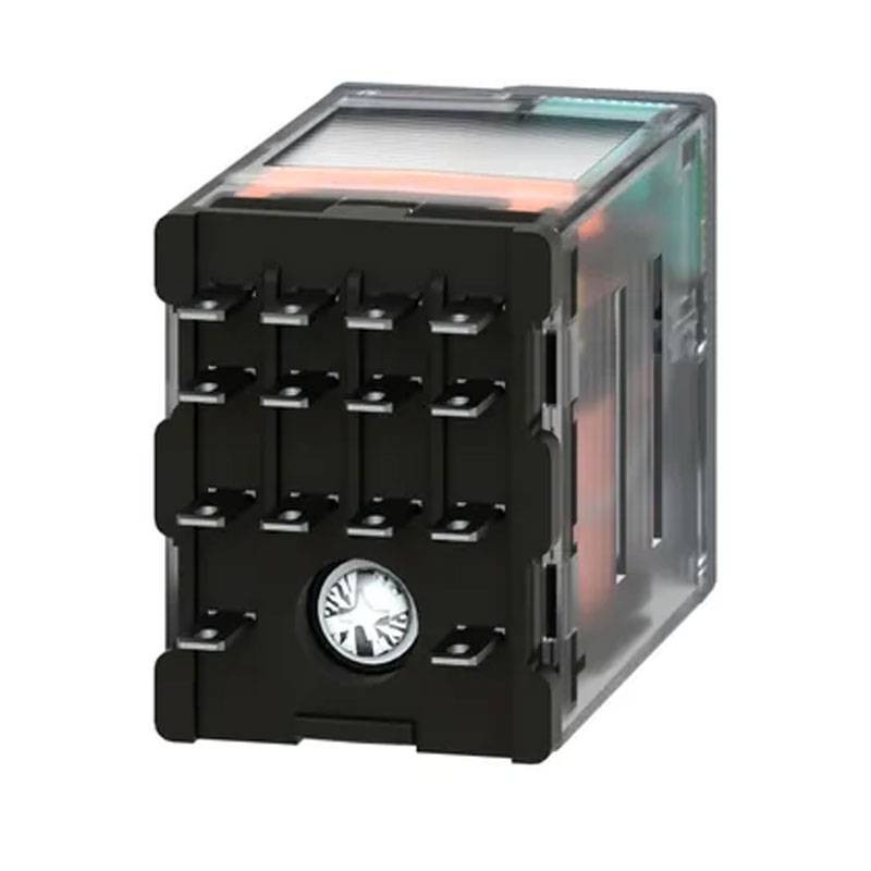 El relé miniatura de conexión RXM de Schneider tiene una tensión de conmutación de bobina de 24 V DC y 4 contactos de conmutación 4PDT (cuadruplicado, doble contacto) con un valor nominal de 6 A. Dispone de un indicador mecánico y de un botón de prueba bloqueable.