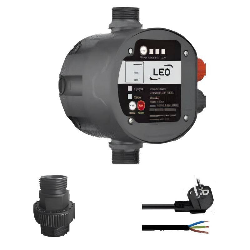 Presostato de flujo electrónico Leo Pumps para electrobombas con triple función (presión, caudal, tiempo), rearme automático y presión de rearme regulable. Completo con manómetro y cables, con las siguientes características: