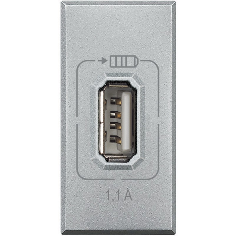 Cargador USB Bticino Axolute Grey tech. El cargador está alimentado y sirve para cargar teléfonos móviles, smartphones, tabletas y todos los dispositivos que se puedan cargar por USB.