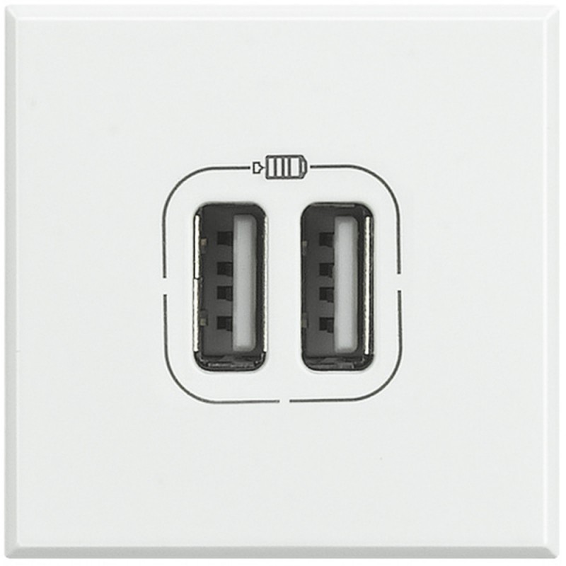 Bticino Axolute blanco cargador de doble enchufe USB. El cargador está alimentado y sirve para cargar teléfonos móviles, smartphones, tabletas y todos los dispositivos que se puedan cargar por USB.