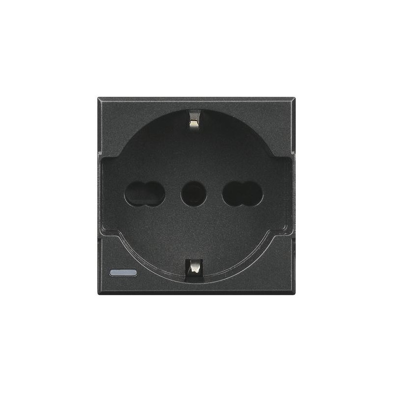 Bticino Axolute Gris Antracita toma de corriente universal schuko. La toma de corriente schuko, también conocida como toma de corriente alemana, permite introducir en su interior cualquier enchufe (pequeño, grande y schuko).