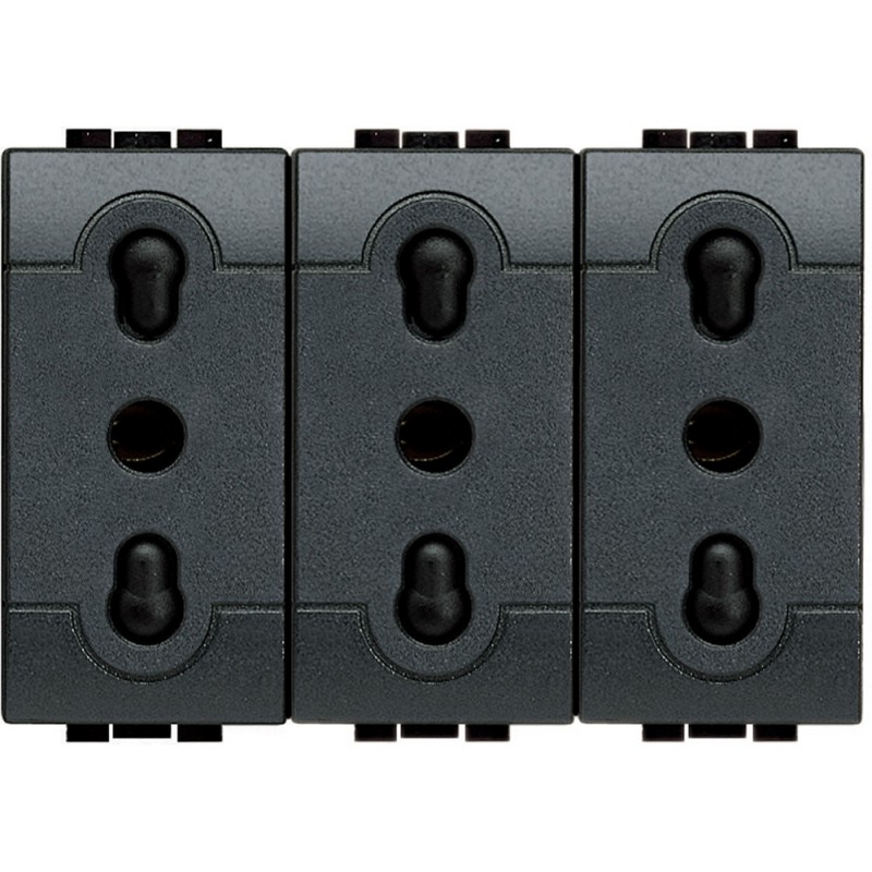Toma de corriente triplex bidireccional Bticino LivingLight antracita (ya puenteada en el interior). La toma de corriente de dos polos permite introducir en su interior tanto enchufes de 10 A (enchufes pequeños) como enchufes de 16 A (enchufes grandes).