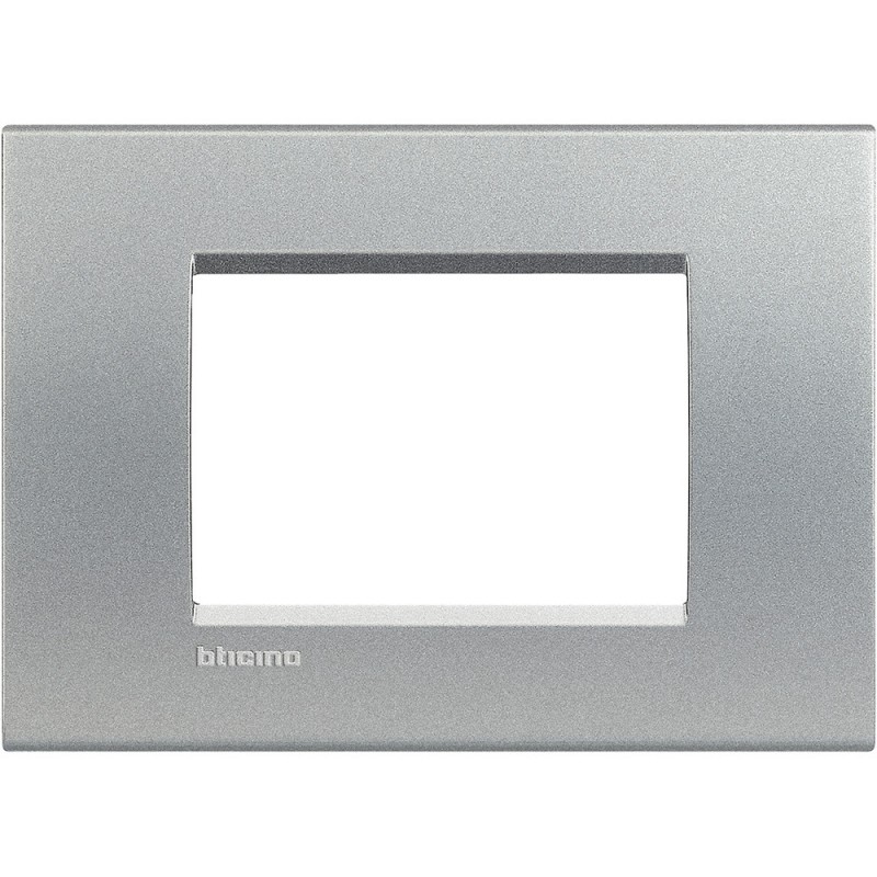 Placa Quadra 3 módulos (frutas, lugares) Bticino LivingLight gris tech. Sólo se puede instalar el soporte LN4703. La placa no se instala en otras series Bticino, sino sólo en LivingLight.