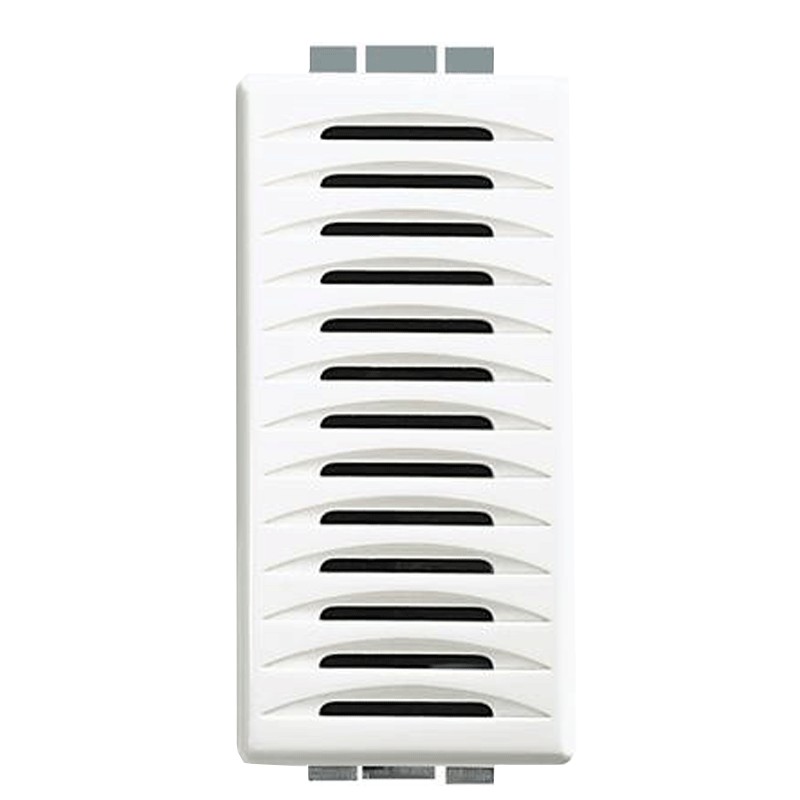 Timbre Bticino Luna en bronce 230V 8VA 80dB, color blanco. Conectado a un botón, el timbre suele utilizarse para la puerta principal. Debe conectarse directamente a la red eléctrica, no necesita ninguna fuente de alimentación.