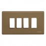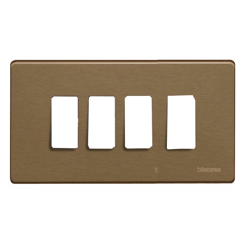 Placa para interruptores Bticino Magic, 4 plazas (módulos) color bronce, con placa inferior aislante y soporte gradual de acoplamiento 504S.