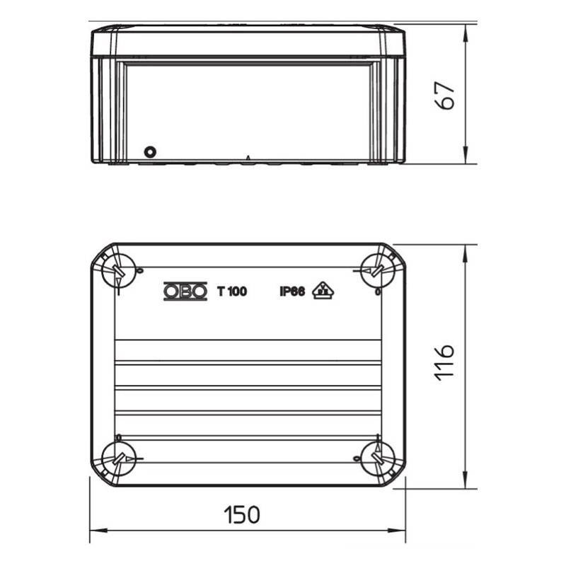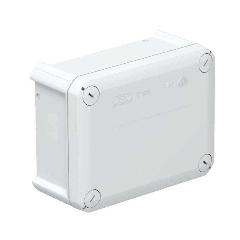 Caja de empalmes para conectar cables y líneas en interiores y exteriores protegidos. Forma rectangular sin entradas. Apto para montaje en pared, techo y placas de montaje. Con posibilidad de fijación interior y montaje en esquinas. Tapa con cierre rápido, precintable. Fabricado con materiales libres de halógenos. Caja de conexiones según DIN EN 60670. Ignífugo según DIN EN 60695-2-11, temperatura de ensayo 650 °C. Resistencia al impacto IK07 según DIN EN 50102.