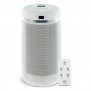 Ventilador de mesa/suelo equipado con mando a distancia por infrarrojos y calefactor eléctrico de tipo cerámico, útil para necesidades específicas de calefacción auxiliar de locales residenciales de tamaño pequeño o mediano.