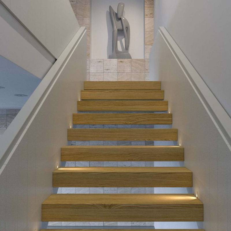 Instalado empotrado en la pared, ideal para resaltar pasajes, senderos, entradas y escaleras.