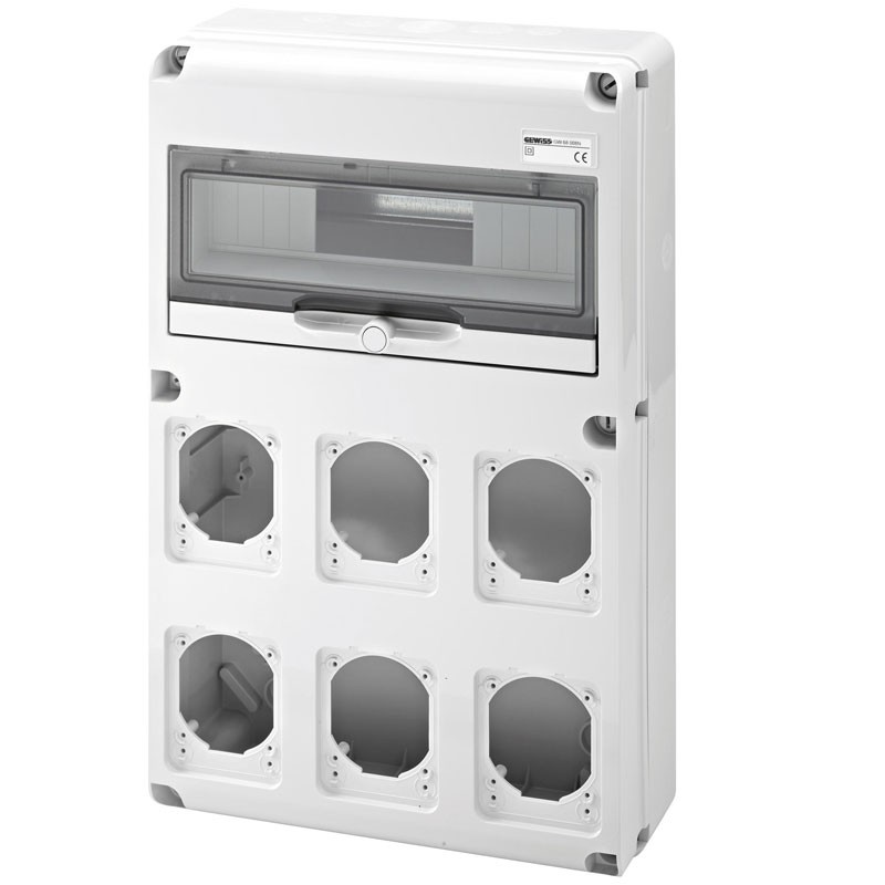 Centralita Gewiss, 14 módulos con 6 bridas para tomas de corriente industriales.