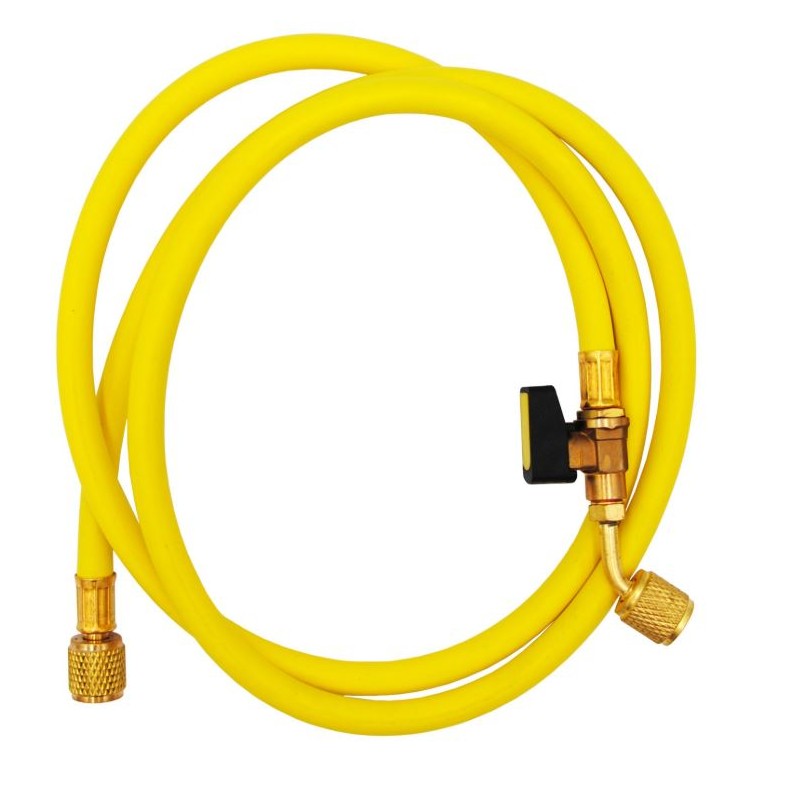 La manguera Tecnogas es la elección ideal para el trabajo profesional en sistemas de refrigeración y aire acondicionado, en particular para la conexión entre la bomba de vacío y la unidad de manómetros. Su color amarillo sigue la codificación estándar, indicando su uso para la línea central o de servicio.