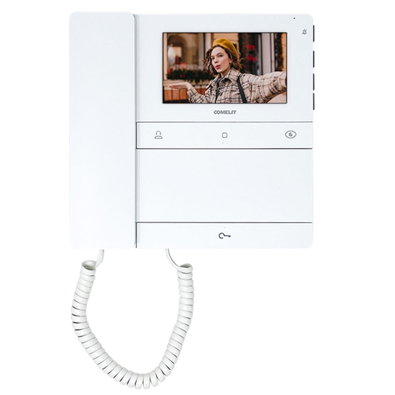 Versión con microteléfono y pantalla de 4,3 pulgadas / 16:9. El videoportero puede programarse, incluso apagado, desde un smartphone mediante la aplicación MyComelit de descarga gratuita. Se suministra con un soporte de pared metálico para un anclaje estable y resistente y un terminal de derivación de línea.