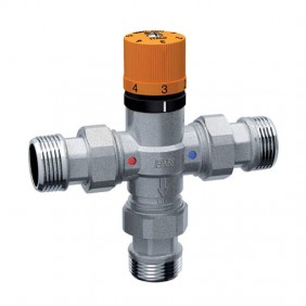 - Mezclador termostático, para instalaciones solares, de latón cromado, con conexiones macho 1/2"-3/4-1"-1"1/4-1"1/2 con asiento plano completo de racores y juntas de EPDM, mando de regulación, de nylon, provisto de selector numerado del 1 al 5 correspondiente a un campo de regulación de 30-65°C y dispositivo de bloqueo de la temperatura, elemento termosensible de cera. Temperatura máx. de entrada 110°C. Presión máx. de servicio 10 bar.