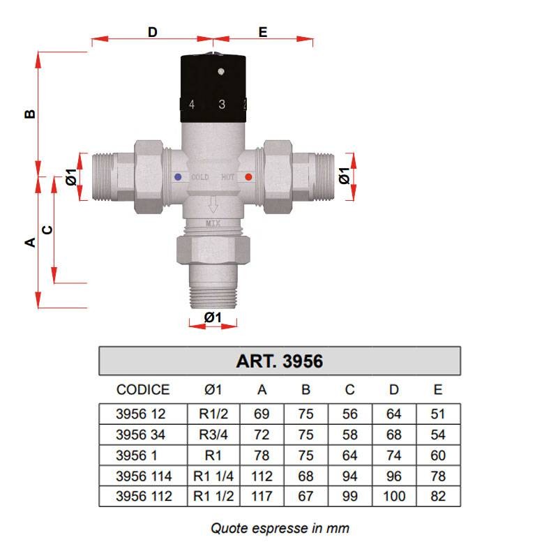 - Mezclador termostático, para aparatos sanitarios, de latón cromado, con conexiones macho 1/2"-3/4-1"-1"1/4-1"1/2 completas de racores y juntas, mando de control, de ABS, provisto de selector numerado del 1 al 5 correspondiente a un campo de regulación de 30÷65°C y dispositivo de bloqueo de la temperatura, función antical, elemento termosensible sensible a la cera. Temperatura máx. de entrada 95°C. Presión máxima de funcionamiento 10 bar.