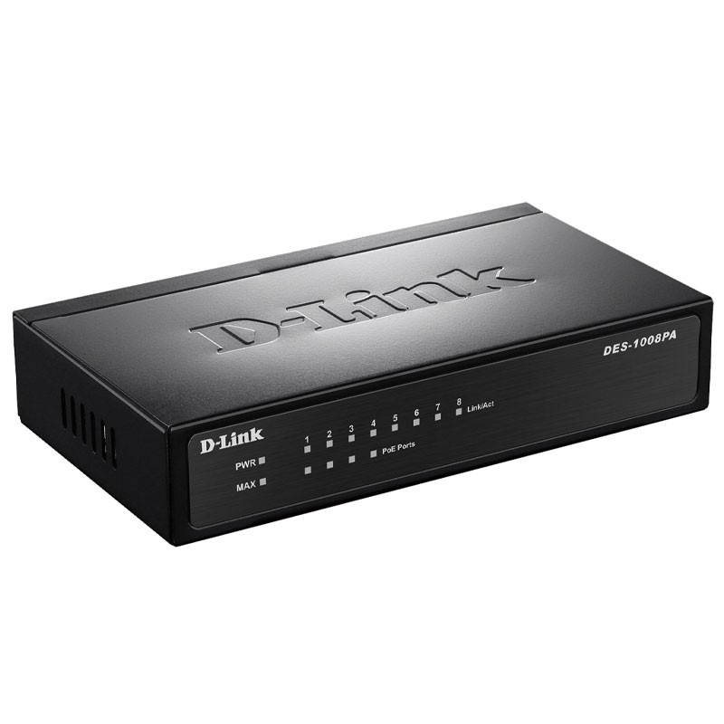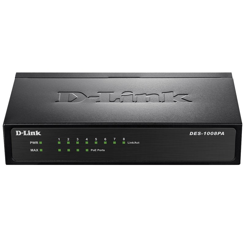 El conmutador de sobremesa D-Link DES-1008PA de 8 puertos PoE Fast Ethernet permite a los usuarios domésticos y de oficina conectar y alimentar fácilmente dispositivos Power over Ethernet (PoE) como puntos de acceso inalámbricos (AP), cámaras IP y teléfonos IP, añadiendo múltiples dispositivos Ethernet como ordenadores, impresoras y almacenamiento en red (NAS) a una red. Diseñado pensando en los usuarios domésticos y de pequeñas empresas, este conmutador PoE compacto funciona de forma silenciosa, por lo que es ideal para su uso en prácticamente cualquier habitación u oficina.