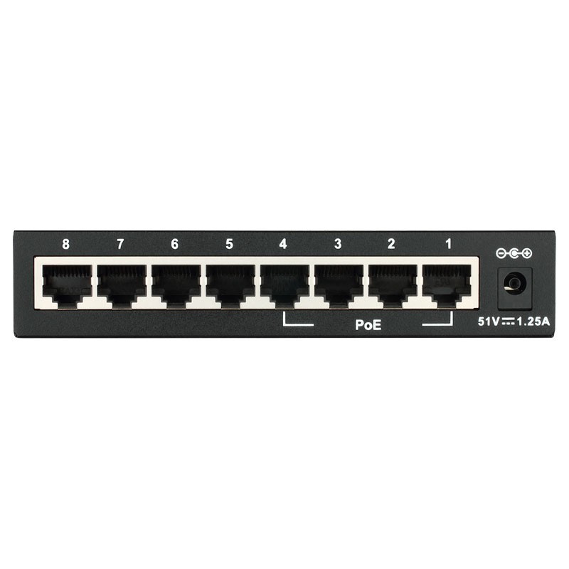 Conmutador de sobremesa no gestionado de 8 puertos PoE Fast Ethernet con las siguientes características: