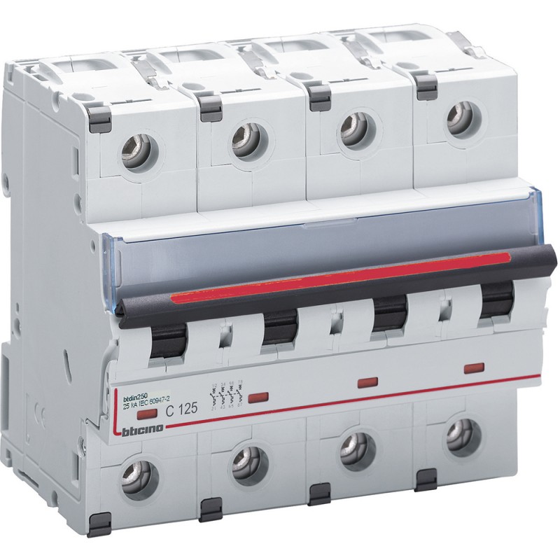 Interruptor automático termomagnético Bticino Corriente In 125A Poder de corte Icu 25KA 4P Curva de disparo C, 6 módulos.