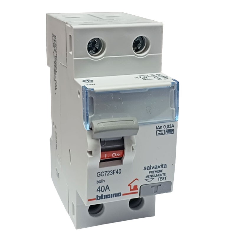 Interruptor diferencial (disyuntor) Bticino, 2 módulos, conexión DIN (universal para cualquier cuadro eléctrico del mercado), 2P polos, 40 amperios, corriente diferencial Idn 30mA, tensión 230/400 Vac, diferencial tipo F.