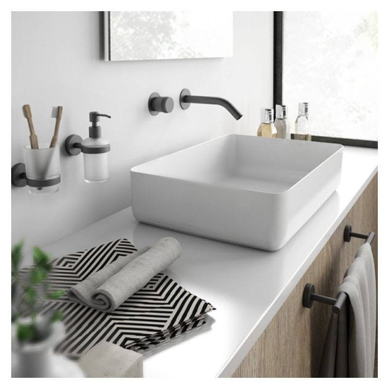 La serie Eros también incluye un dispensador de líquidos, un portaescobillas, un toallero y un portarrollos de papel higiénico.
