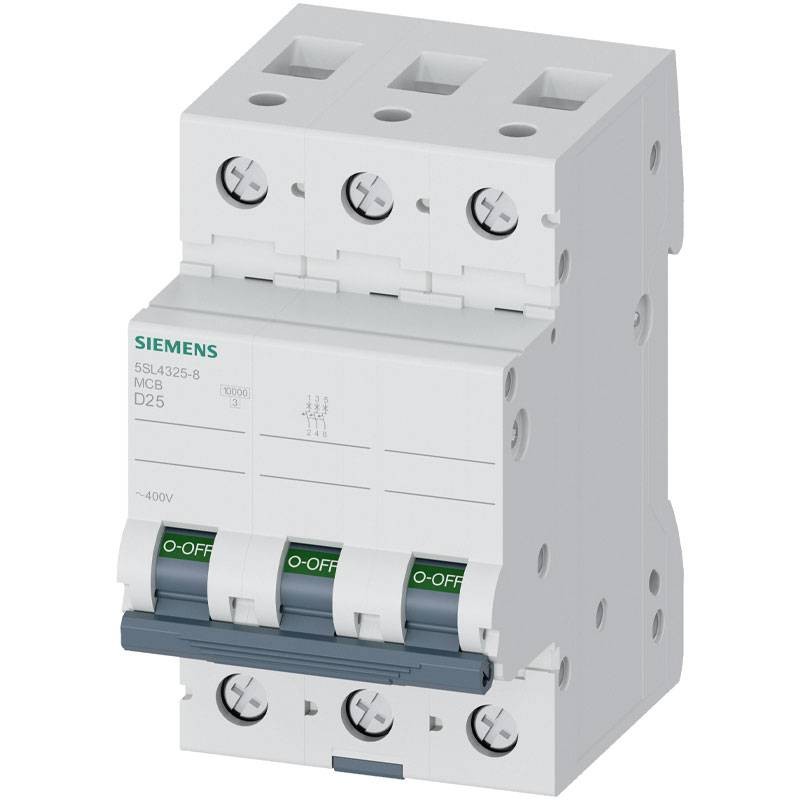 Interruptor magnetotérmico Siemens 5SL43258 3 polos 25A curva D, poder de corte 10 kA. Ideal para circuitos con altas corrientes de arranque como motores, bombas y transformadores.