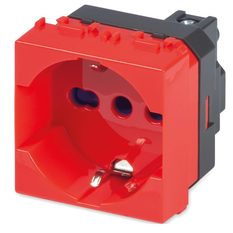 Enchufe universal Schuko de doble punta 2P + T 10/16A 250V Master Mix, 2 módulos color rojo. El schuko (o enchufe alemán), suele utilizarse para alimentar a los usuarios con mayor absorción, como la lavadora, el horno, la aspiradora, el deshumidificador y la plancha.