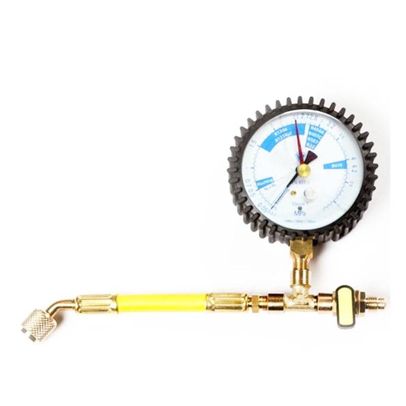 Manguera con manómetro Test Ø80 Wigam clase 1.0 con conexión, 1/4 pulgadas, SAE 45º, accesorio para sistemas de aire acondicionado y refrigeración.
