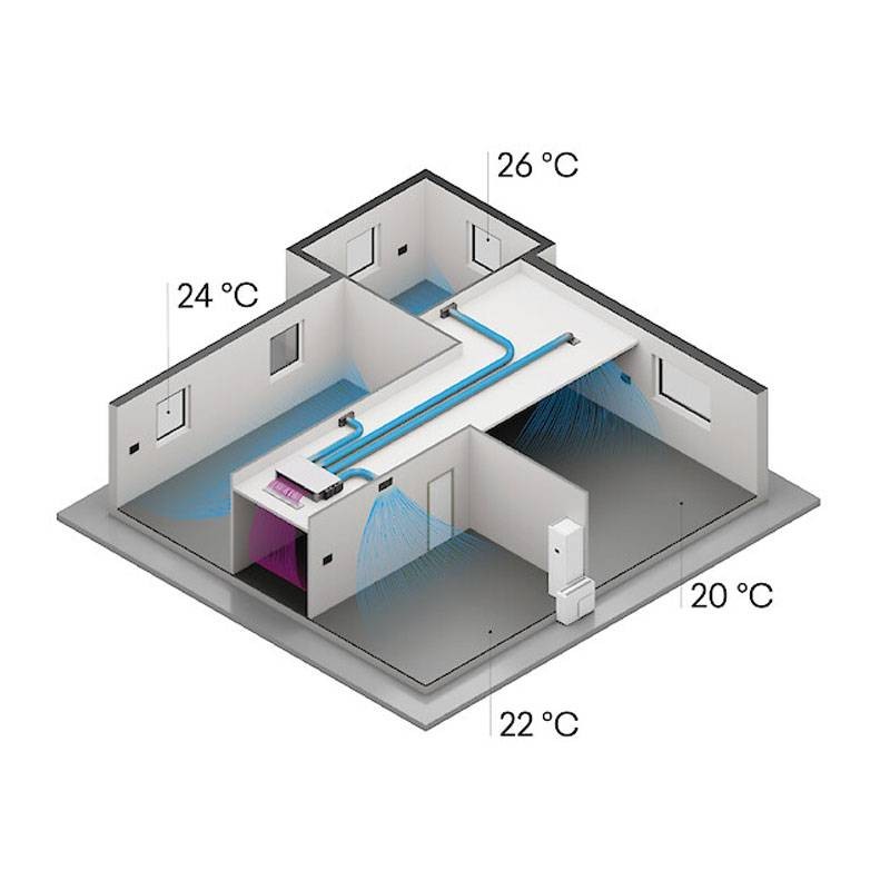 La serie Ducto SLC+ es ideal para instalaciones en falso techo o espacios ocultos, gracias a su diseño compacto y a la posibilidad de conectar mandos a distancia como EEB749II o EFB749II (opcional), para una gestión avanzada de la temperatura, la humedad y la ventilación.