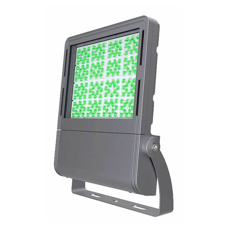 El proyector Playled BIG COLOR ONE está equipado con 144 LED de alta eficiencia dispuestos en una configuración multichip con lentes de PMMA, que garantizan un flujo luminoso nominal de 12507 lúmenes y un rendimiento efectivo de 9231 lúmenes, con un tono verde intenso y un CRI ? 80. El haz estrecho de 30° lo hace ideal para la iluminación arquitectónica, escénica y deportiva.