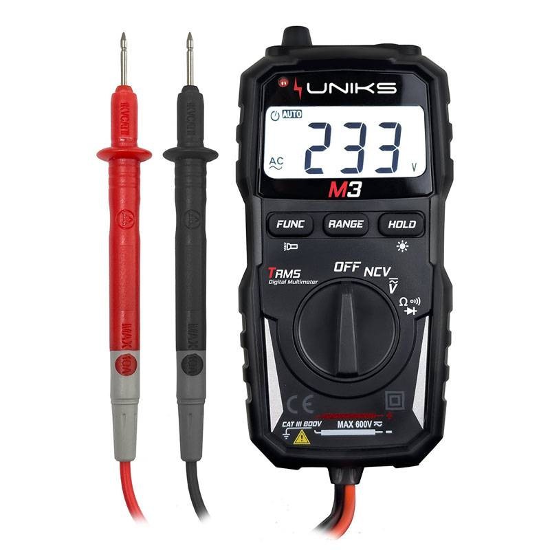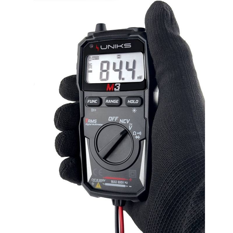 El Multímetro Uniks M3 es un dispositivo de bolsillo diseñado para ofrecer prestaciones profesionales en un formato compacto. Certificado CAT III 600V, es ideal para aplicaciones civiles e industriales, garantizando fiabilidad y seguridad durante las mediciones. Con su tecnología TRMS, el M3 garantiza mediciones precisas de tensión CA/CC, resistencia y continuidad: