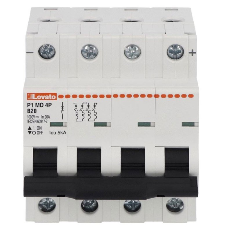 El interruptor magnetotérmico Lovato P1 MD 1000V DC 20A curva B, está diseñado para instalaciones en corriente continua hasta 1000V DC. Con poder de interrupción 5kA y 4 polos, es ideal para aplicaciones fotovoltaicas: