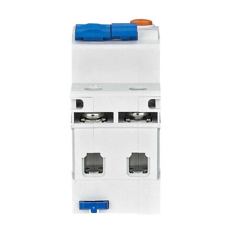 El interruptor se presenta en un formato de módulo de 2 DIN, fácil de instalar en cualquier armario de distribución estándar. La conexión es rápida y segura, con terminales de tornillo. El dispositivo es 1P+N, por lo que protege la fase con desconexión segura del neutro.