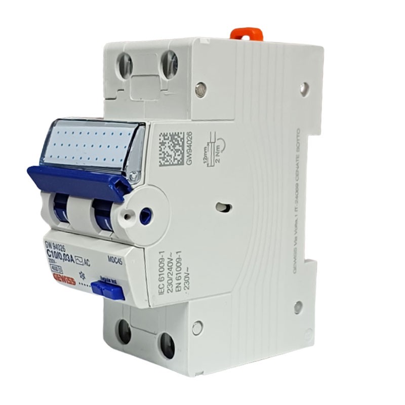 Interruptor magnetotérmico diferencial Gewiss 10A 2P 30MA AC 4,5KA 2 módulos con las siguientes características