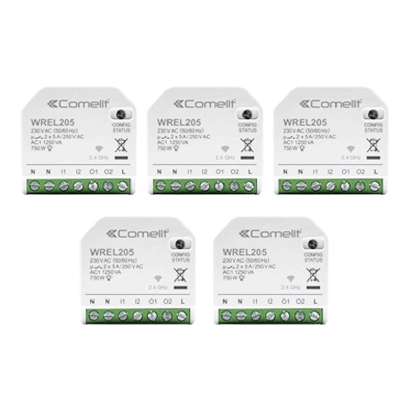 Kit Wi-Fi Comelit, para el control local o remoto de la luz mediante App o asistente de voz. Compuesto por 5 módulos WREL205, compatibles con todas las instalaciones civiles, con las siguientes características:
