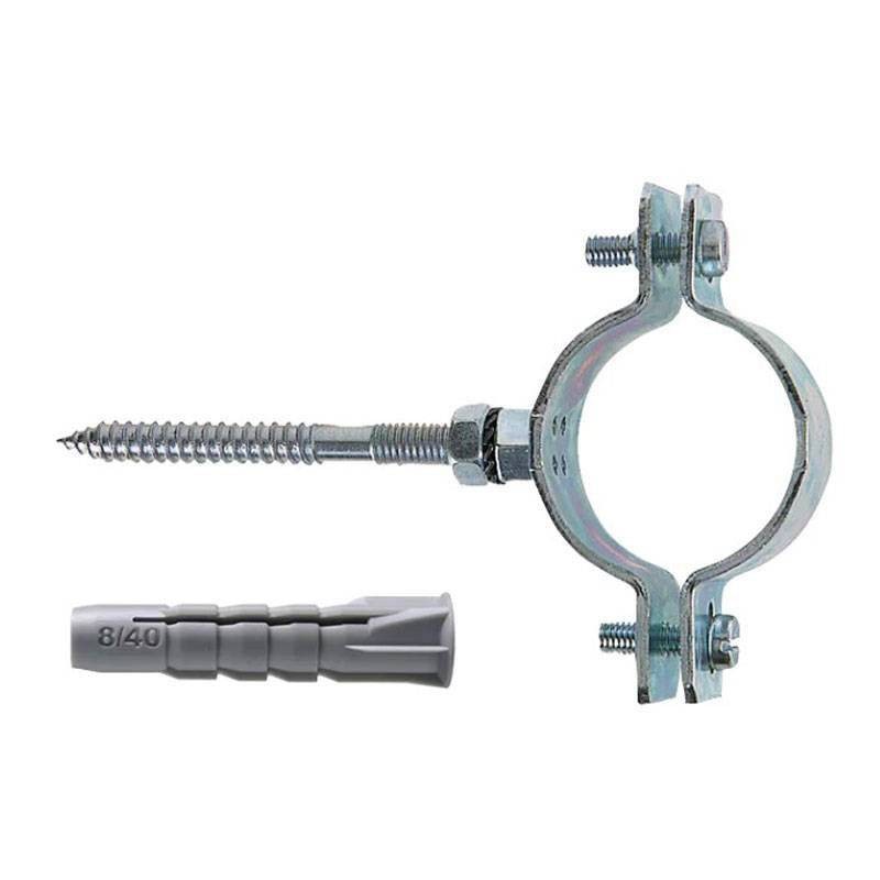 Collar para Tubos Metálicos Fischer CPS-V de acero con cierre rápido, completo con tornillo de doble rosca y tapón SX, ideal para instalaciones de fontanería civil e industrial, con las siguientes características: