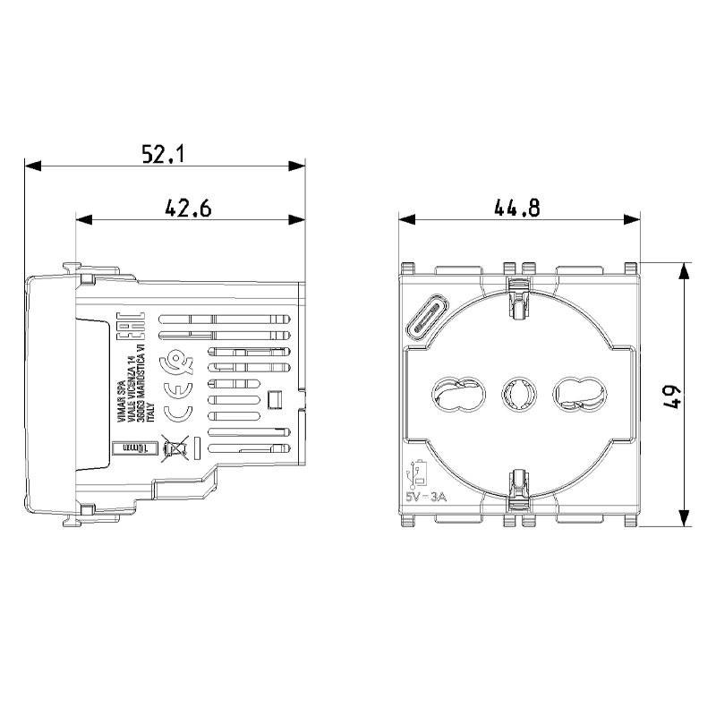 Toma Vimar Plana SICURY 2P+E 16 A 250 V universal norma italiana P40 con alimentación USB 15W - 3A - 5V con 1 salida tipo C para dispositivos electrónicos, color blanco, 2 módulos.