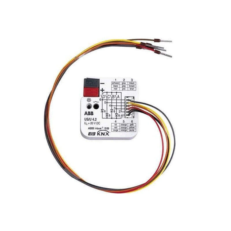 La interfaz universal dispone de 4 canales que pueden configurarse como entradas o salidas. Con estos dispositivos se pueden utilizar interruptores, pulsadores convencionales, contactos auxiliares, LEDs y relés electrónicos para realizar una gran variedad de aplicaciones. La longitud máxima de los cables de conexión a las entradas es de 10 m. La tensión de exploración y la alimentación de los LEDs (máx. 2 mA) son proporcionadas directamente por el aparato.