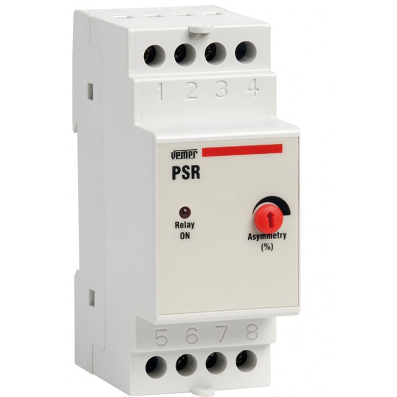 El relé de control de fases Vemer PSR400, montado en carril DIN, detecta la secuencia exacta de las fases en sistemas trifásicos y el desequilibrio de tensión provocado por la disminución o ausencia de una de las fases.