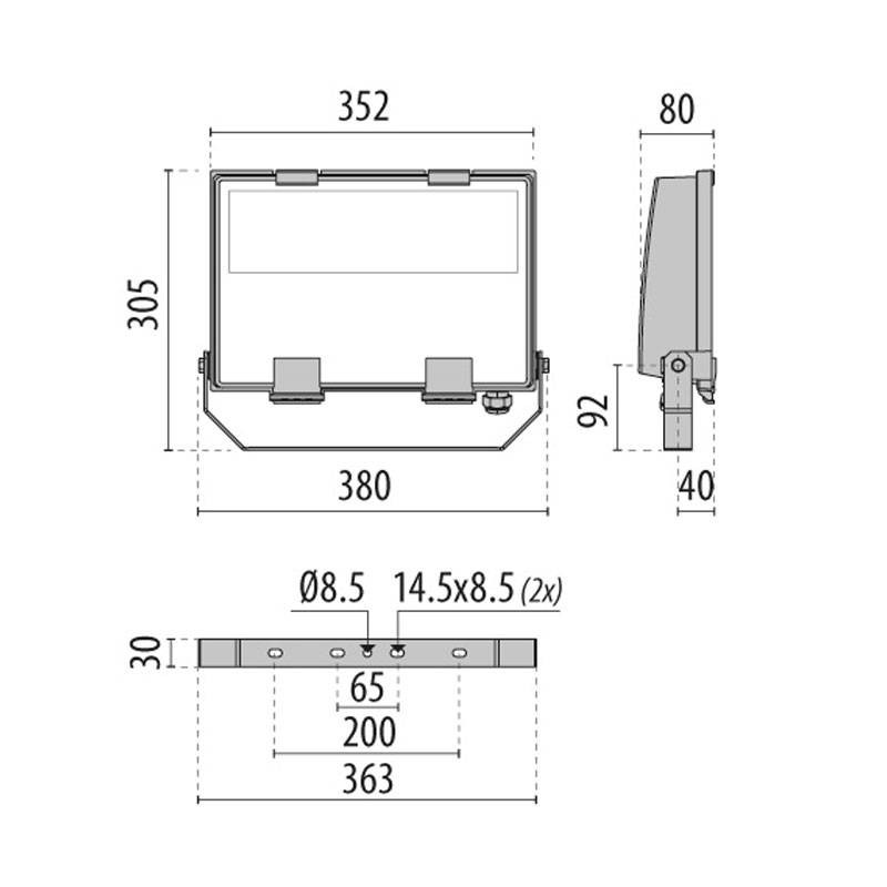 El proyector soporta un amplio rango de alimentación 100–305 V AC / 142–431 V DC, con factor de potencia >0,9 y protecciones contra sobretensiones (6 kV modo común / 4 kV diferencial). Las prestaciones luminosas están garantizadas en el tiempo con L80B10 @ 65.000 h, haciéndolo adecuado para instalaciones continuas y profesionales incluso en condiciones climáticas extremas (–40 °C / +30 °C).