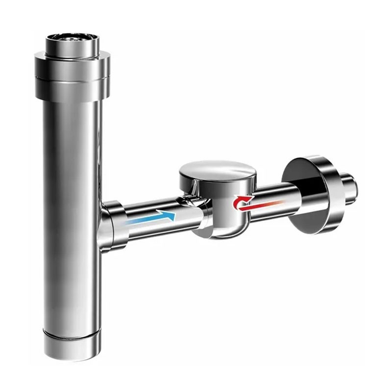 El acabado cromado añade un toque estético limpio y coherente con la grifería y los accesorios de baño, útil sobre todo cuando la parte bajo lavabo está a la vista o en contextos donde se presta atención a los detalles.