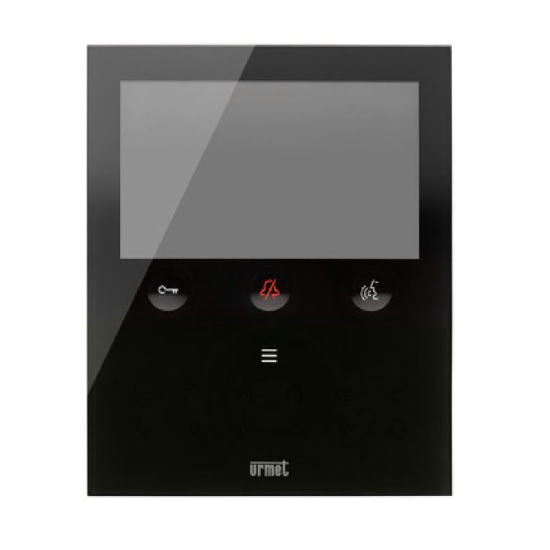 Urmet VOG5W 1760/15U es el videoportero manos libres 2Voice de 5" en vidrio negro con Wi-Fi 2,4 GHz: transfiere la llamada a smartphone, soporta comandos de voz/Alexa y gestos “sin contacto” con sensor IR.