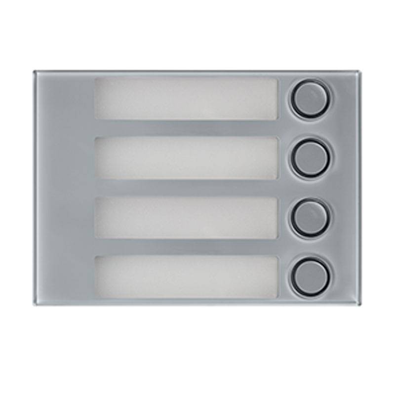 Placa frontal Urmet Alpha con cuatro pulsadores de llamada, para montaje en el módulo de pulsadores 1168/4. Sólo para System 2 Voice. Color gris. De material termoplástico con tratamiento anti-UV. Dimensiones 124 x 90 mm.