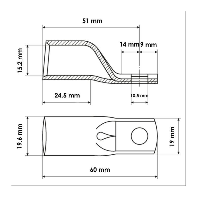 Fabricado en cobre electrolítico recocido con una pureza superior al 99,9%, el terminal de cable garantiza una excelente conductividad y resistencia mecánica. El estañado protege el terminal de la oxidación, mejorando su durabilidad incluso en entornos de alta humedad o con contaminantes.