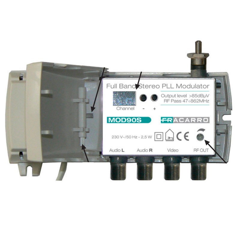 Modulateur Fracarro analogique MOD90S Audio/Vidéo Stéréo A2 à double bande latérale, avec les caractéristiques suivantes :