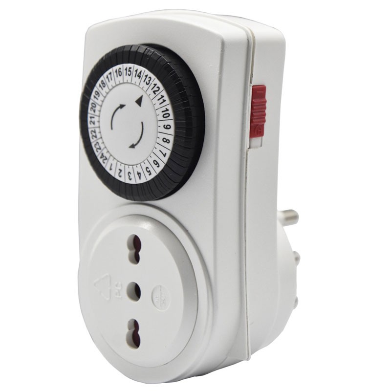 Interrupteur horaire électromécanique avec montage à prise, idéal pour le contrôle de petites charges domestiques comme les lampes, ventilateurs, appareils électroménagers ou chargeurs. Sa programmation journalière permet d'automatiser l'allumage et l'extinction des appareils, optimisant ainsi la consommation et améliorant la sécurité.