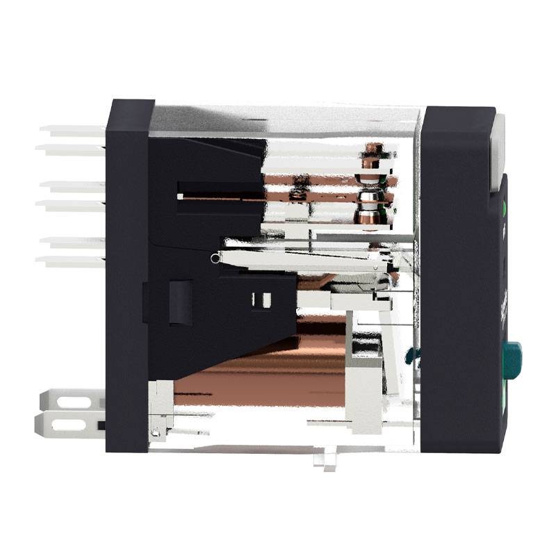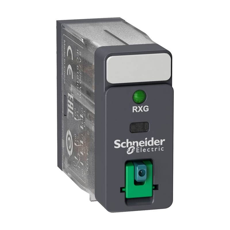 Le relais enfichable RXG de Schneider a une tension de commande de bobine de 24 V CC et dispose de 2 contacts de commutation DPDT (double pôle, double contact) d'une valeur nominale de 5 A. Il est doté d'indicateurs LED et d'un bouton de test verrouillable. Il est doté d'indicateurs LED et d'un bouton de test verrouillable.