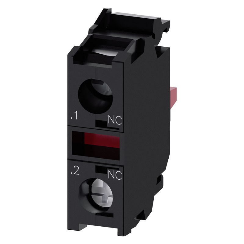 Module de contact Siemens Sirius avec 1 contact normalement fermé (NC) et fonction d'ouverture positive. Idéal pour une utilisation industrielle, montage sur plaque frontale et raccordement par bornes à vis, avec les caractéristiques suivantes :