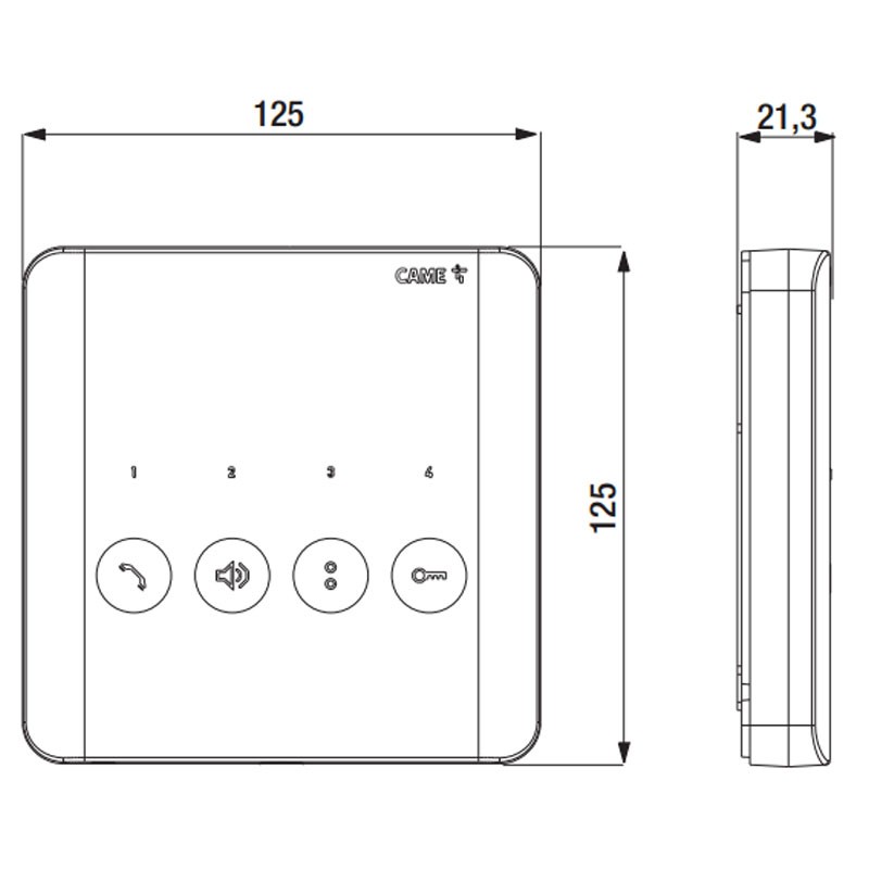 - Interphone mural caractérisé par 4 boutons tactiles principaux qui permettent de gérer les fonctions primaires telles que répondre et raccrocher la communication, ouvrir la porte, régler/exclure la sonnerie (avec signalisation par LED en cas d'exclusion) et envoyer une commande auxiliaire programmable.