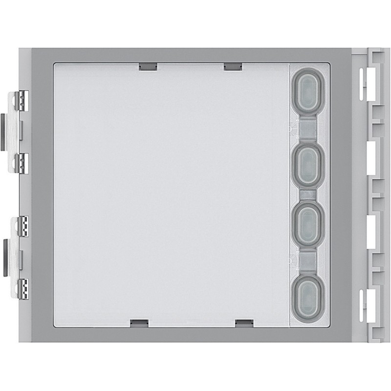 Module Bticino Sfera avec 4 boutons supplémentaires disposés sur une seule colonne. Connexion via le multicâble fourni. Rétro-éclairage du badge commandé par le module sonore ou par le module combiné audio-vidéo.